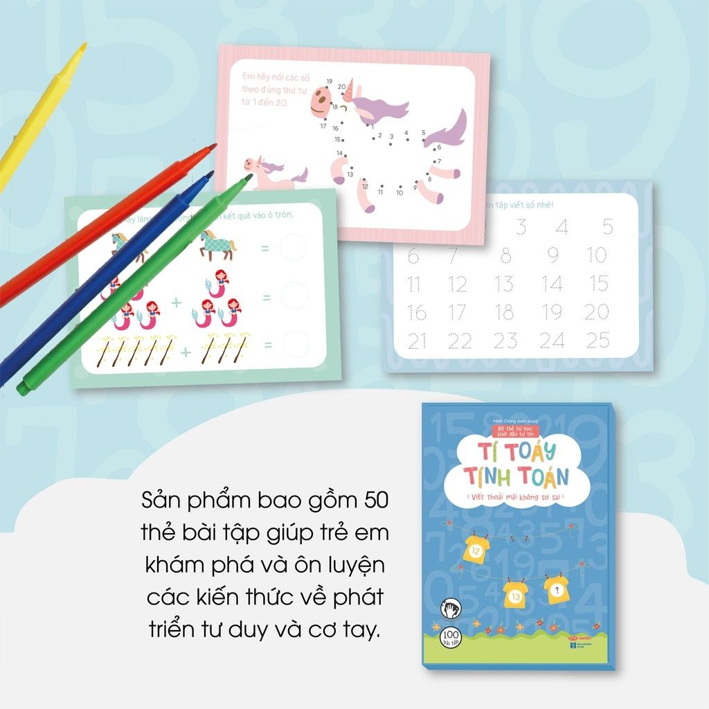 Bộ sản phẩm bao gồm 50 thẻ bài tập giúp trẻ em khám phá và ôn luyện các kiến thức về toán học cơ bản.
